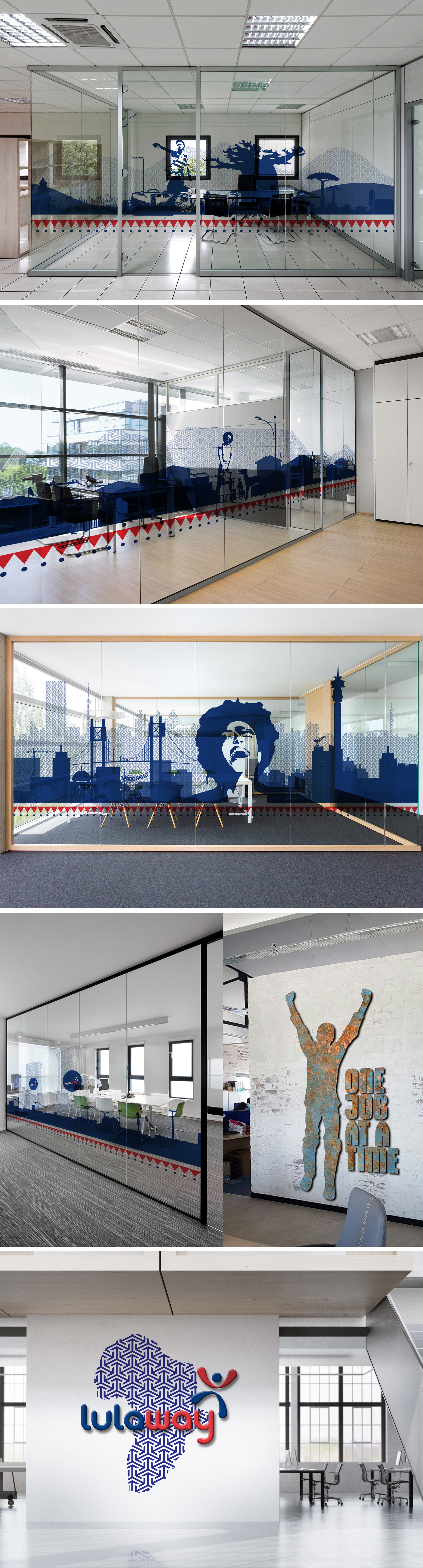 Lulaway asked us to create branding for their new head office that would provide an appealing atmosphere to staff and prospective job seekers. Our wall decals told the story of a jobseeker from Cape Town, Joburg and even rural areas through some iconic skylines and expressions.