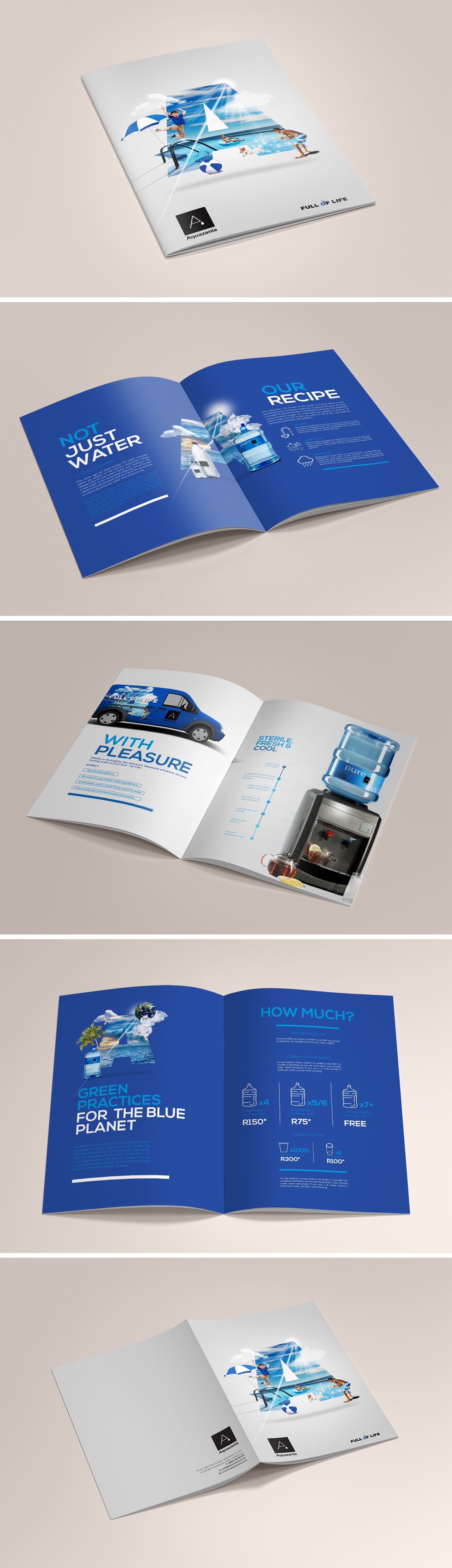 Aquazania Water required new branding that speaks to the essence of the company. Our Full of Life campaign hit the nail on the head and was then applied to their brochures and bottle branding.